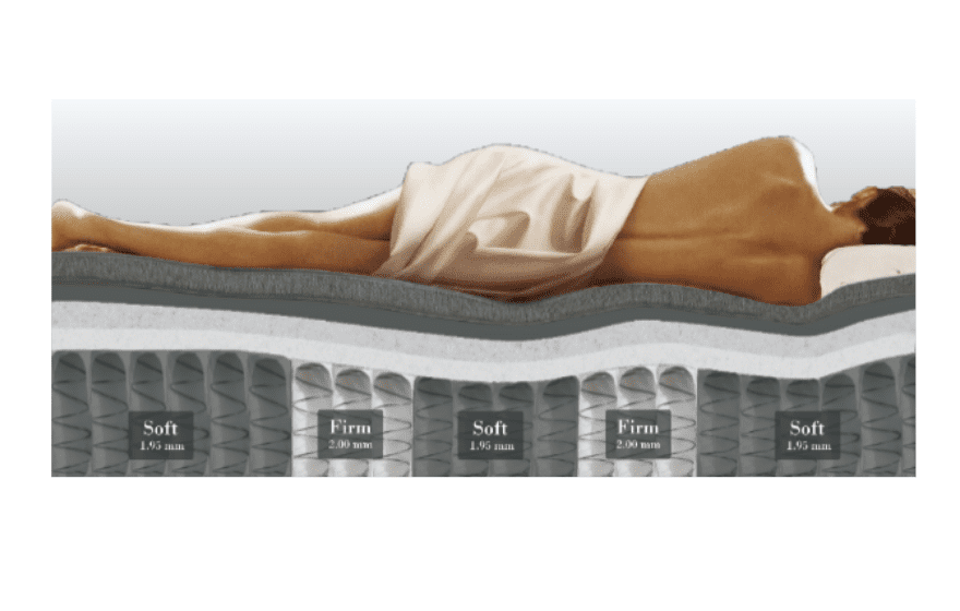 根據人體工學將不同承托力之彈簧分佈床褥五區,平均承托身體重量。